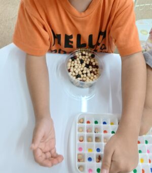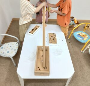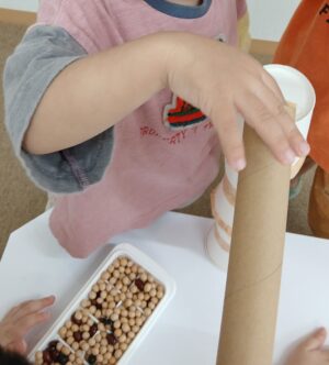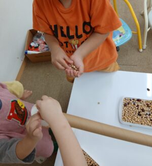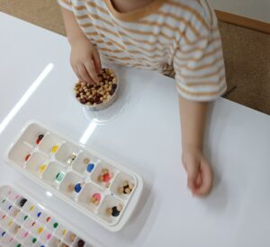 豆を使った様々な遊びを通して、指先の感覚が養われ、集中力や達成感も高まっていきます。