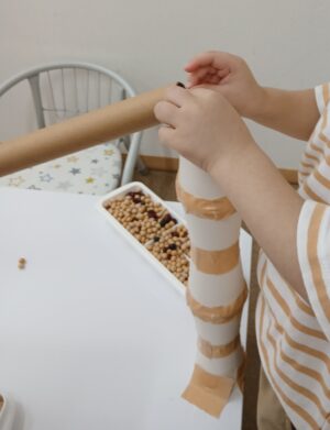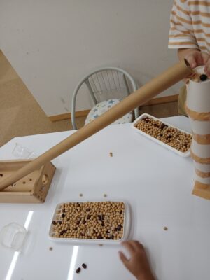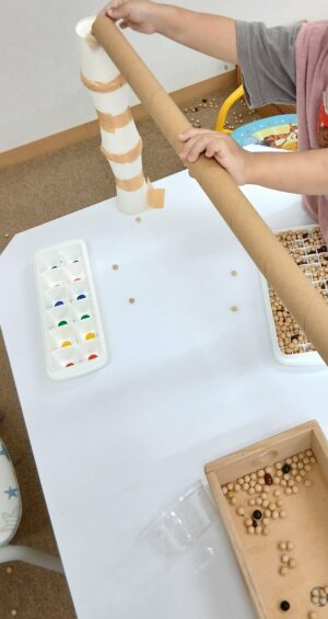 筒のスライダーに豆を流して滑らせる遊びもしました。