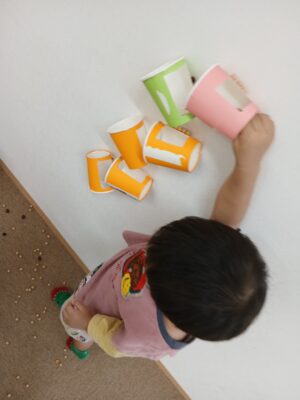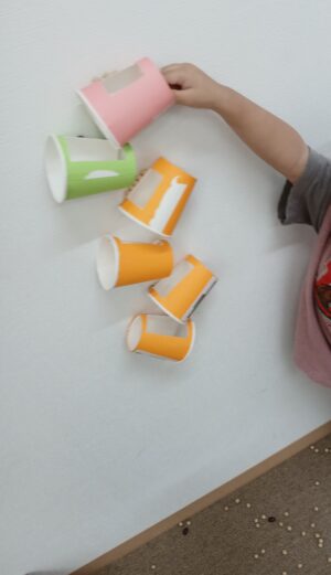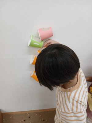 壁に貼った紙コップに豆を入れて、落ちてくる様子をじっくり観察しています。