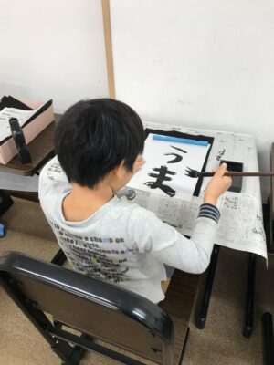 年明けのお習字のプログラムでは『書初め』を行いました。文字は今年の干支である”うま”です🐎