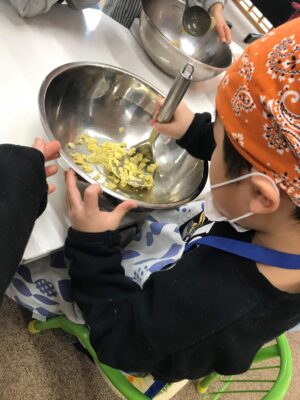 ミニおせちでは、手綱こんにゃく、さつまいもきんとん作りにチャレンジ!